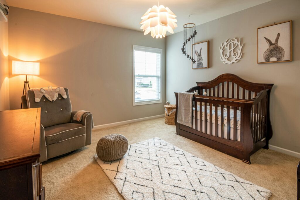 Soft, pastel or neutral tones like lavender, mint, or soft grey create a peaceful atmosphere. Avoid stimulating patterns or overly bright wall art which can overwhelm a newborn’s senses.